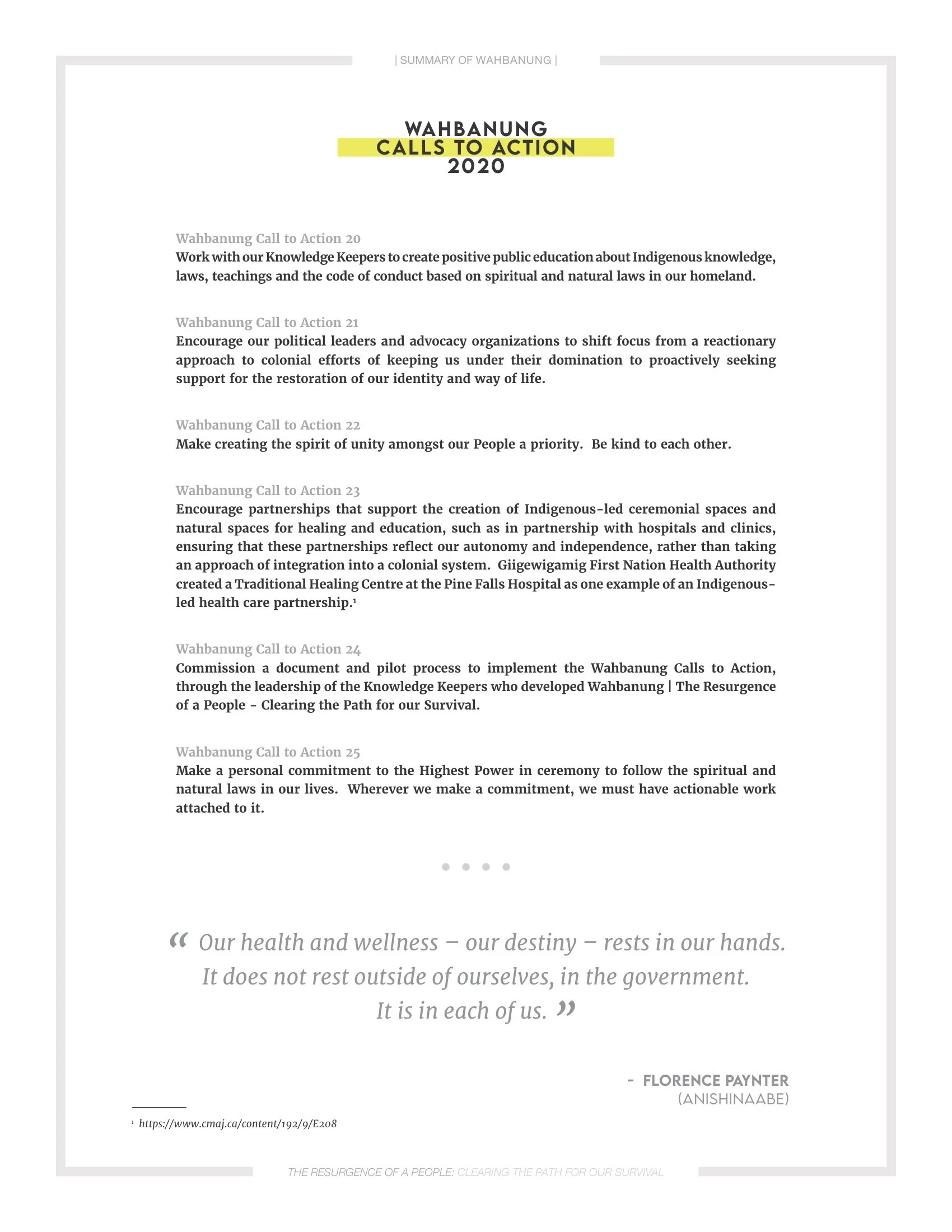 Together, they sound an emergency warning and offer a blueprint forward for all peoples to stand with the Great Binding Laws of the Creator and Mother Earth. In 1971, Manitoba’s First Nation leaders released WAHBUNG: Our Tomorrows (1971), published by the Manitoba Indian Brotherhood as their position paper in response to Trudeau’s White Paper. It continues to be an agenda for action that included First Nations’ inherent right to design and have full authority over their health, education, and child and family services systems, informed by First Nations worldviews, laws, and approaches.