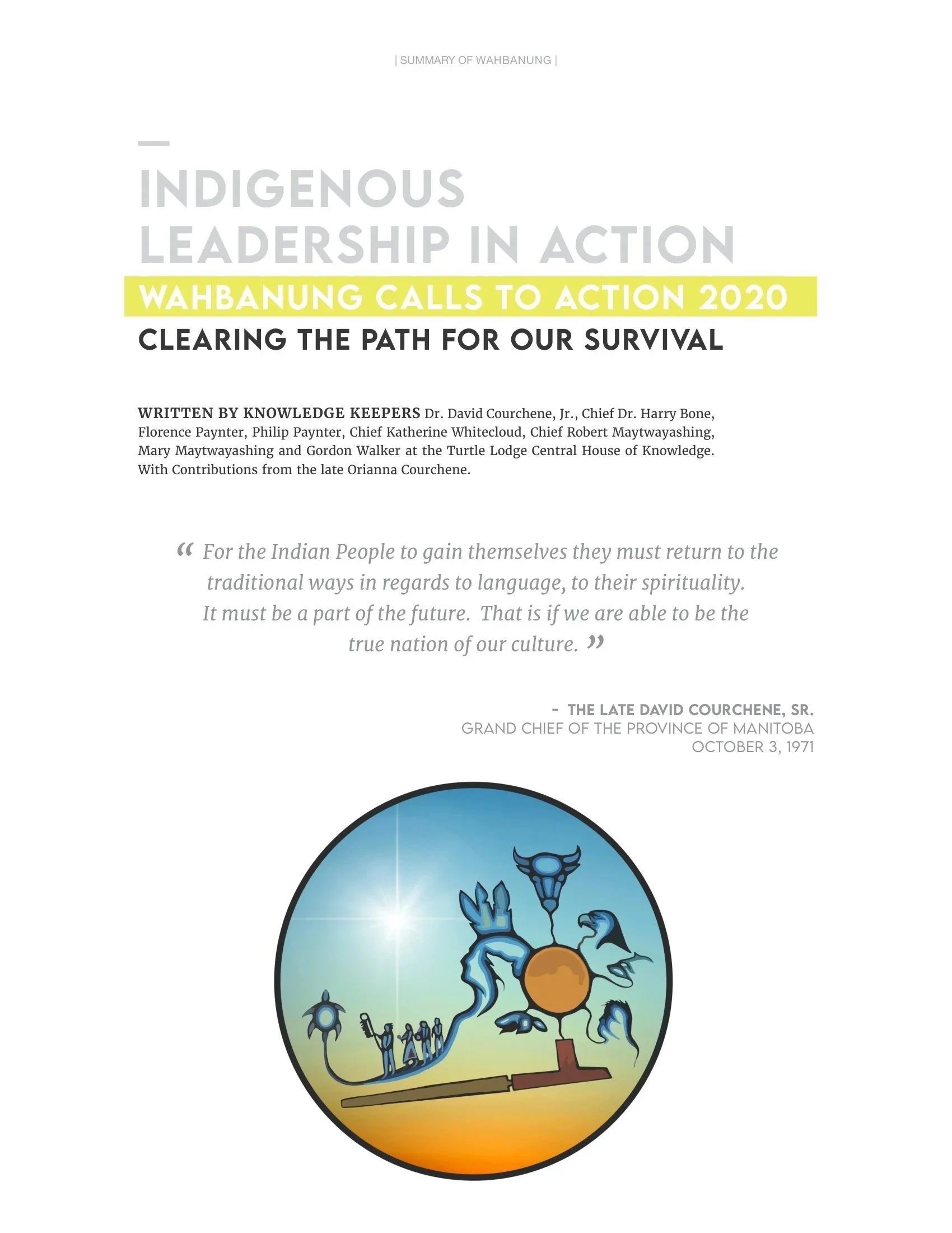 Summary of Wahbanung – The Resurgence of Our People: Clearing the Path for Our Survival was written by Knowledge Keepers the late Dr. David Courchene, Jr., Chief Dr. Harry Bone, Florence Paynter, Chief Katherine Whitecloud, Chief Robert Maytwayashing, Mary Maytwayashing, and Gordon Walker at the Turtle Lodge. With Contributions from the late Orianna Courchene.